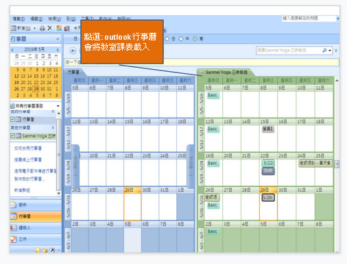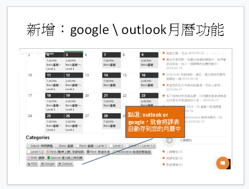 教室新增:google outlook 行事曆自動載入功能,您可使用該功能,將教室課表自動載入,很方便喔。。